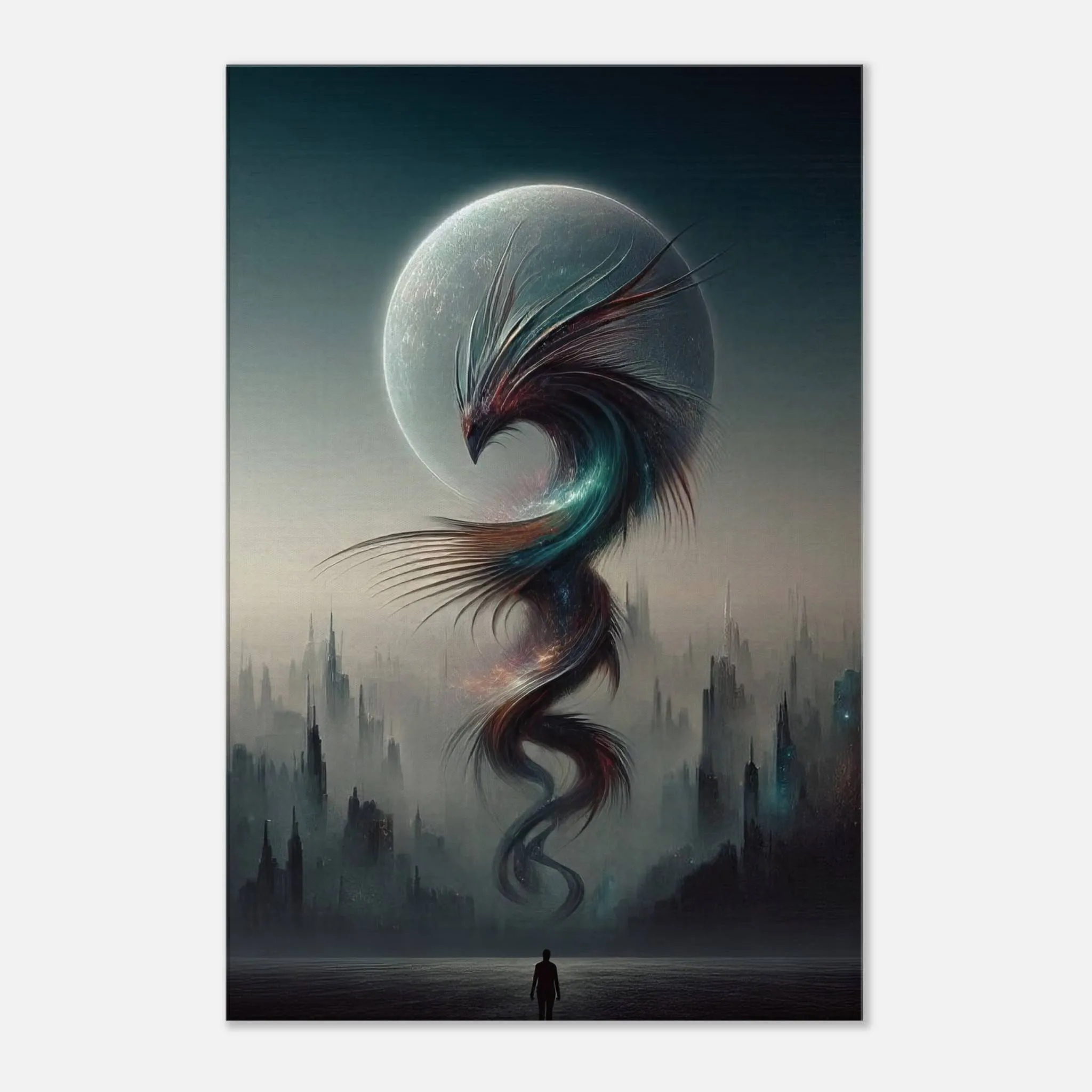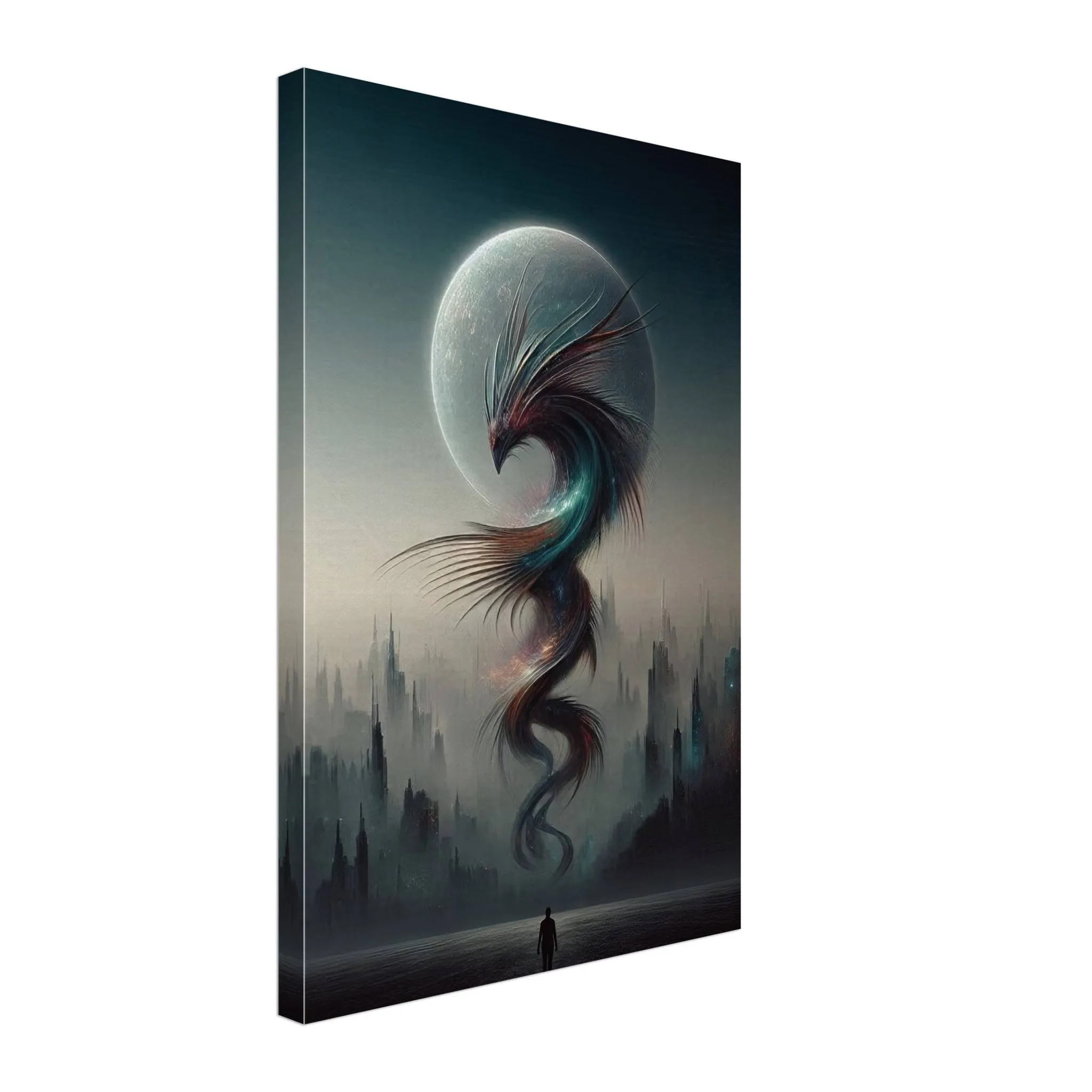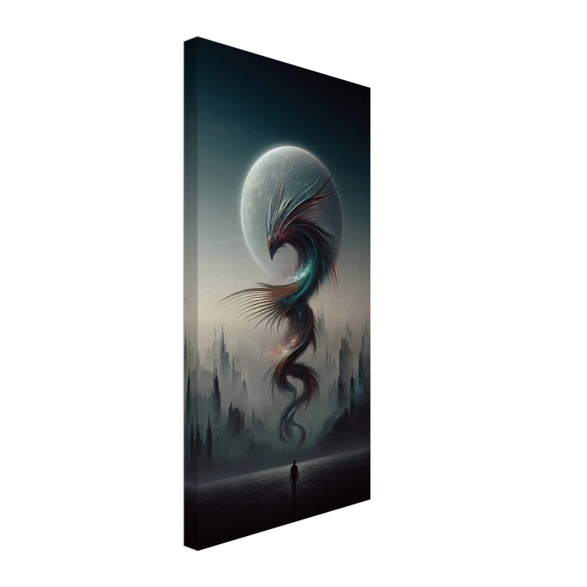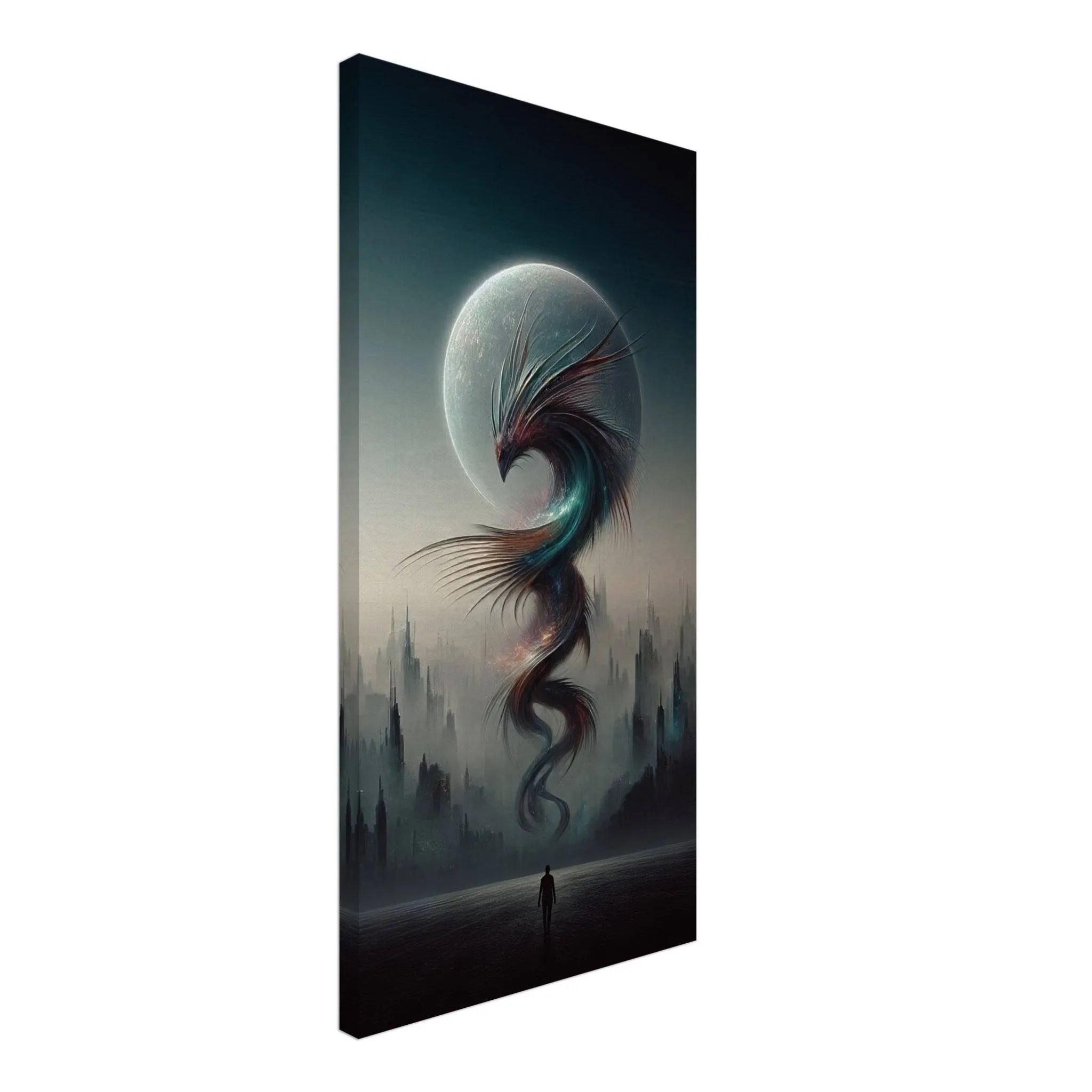 Invite the magic of the cosmos into your space with Celestial Emergence, an awe-inspiring canvas print that blends fantasy, mysticism, and otherworldly beauty. This surreal masterpiece features a majestic creature—part dragon, part cosmic guardian—unfurling its form in graceful spirals above a starlit cityscape. Suspended within a vibrant nebula, it illuminates the skies with presence and power, as if awakening from celestial slumber.