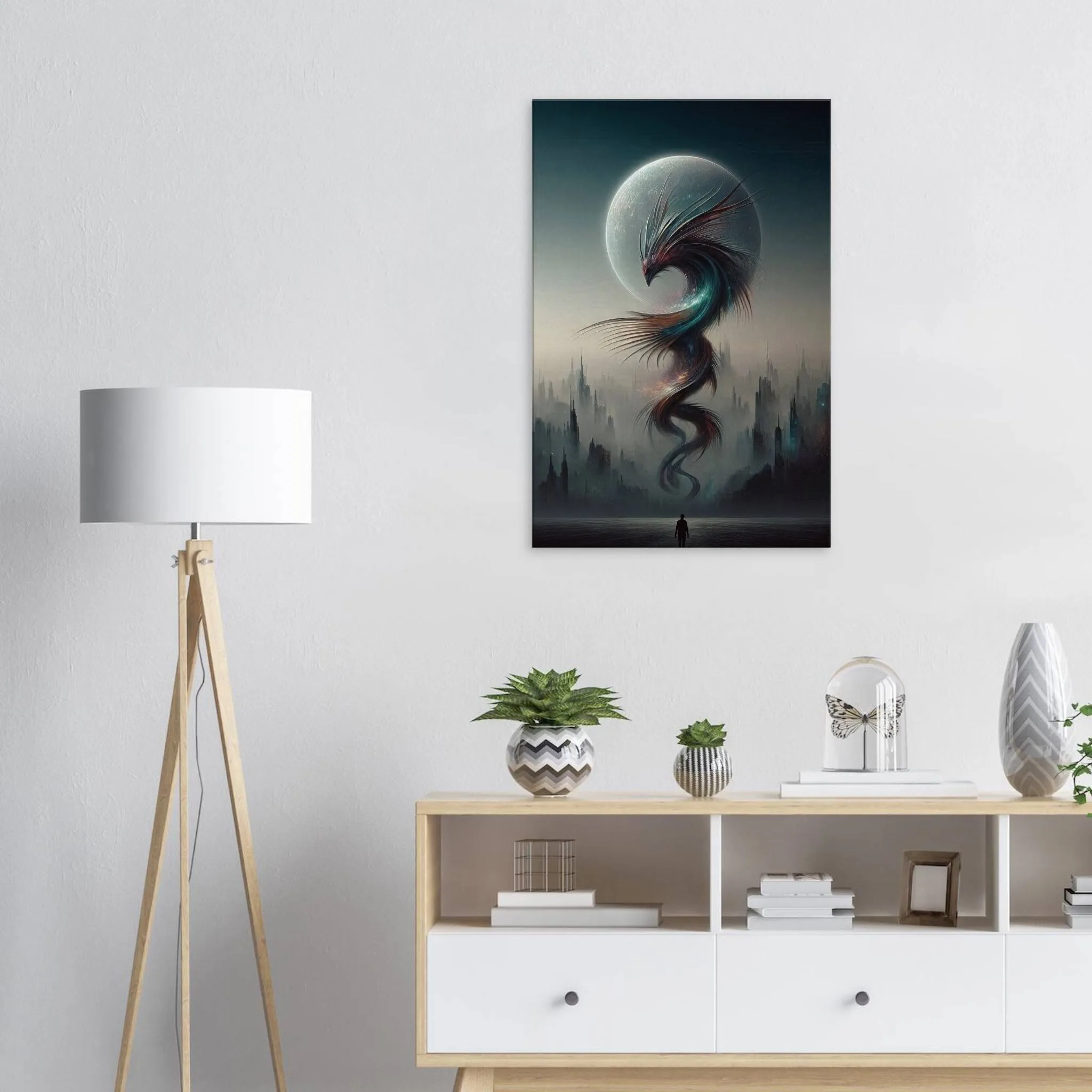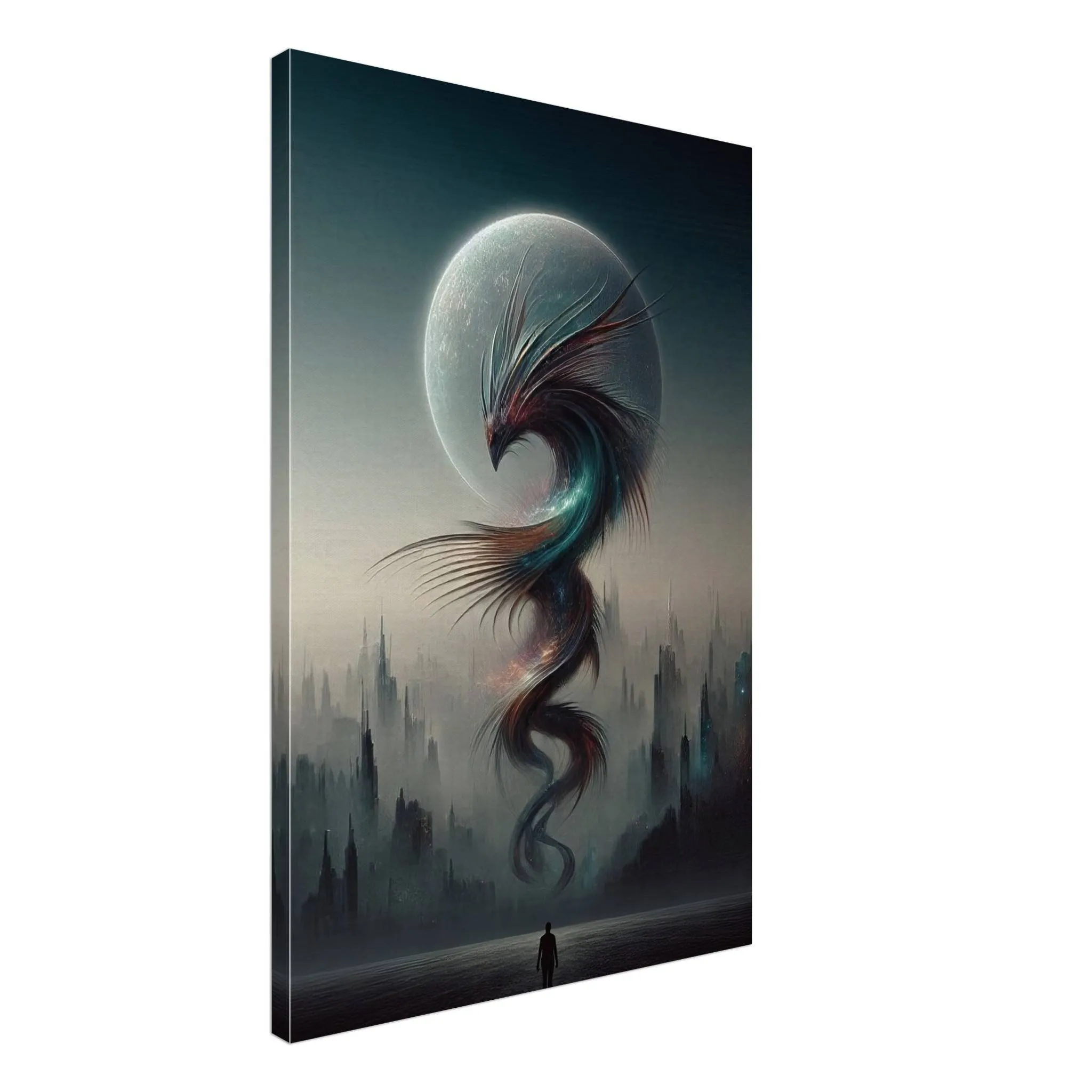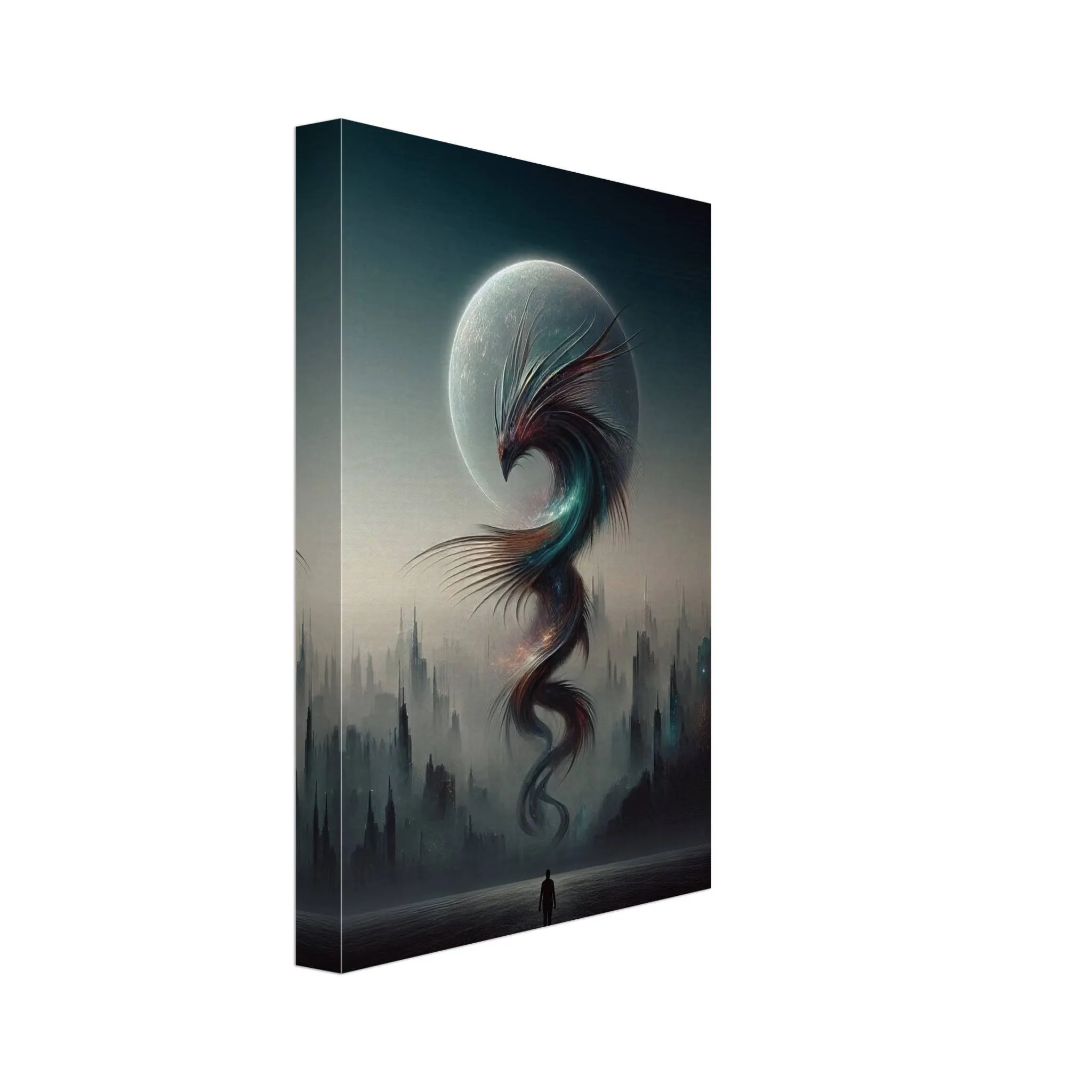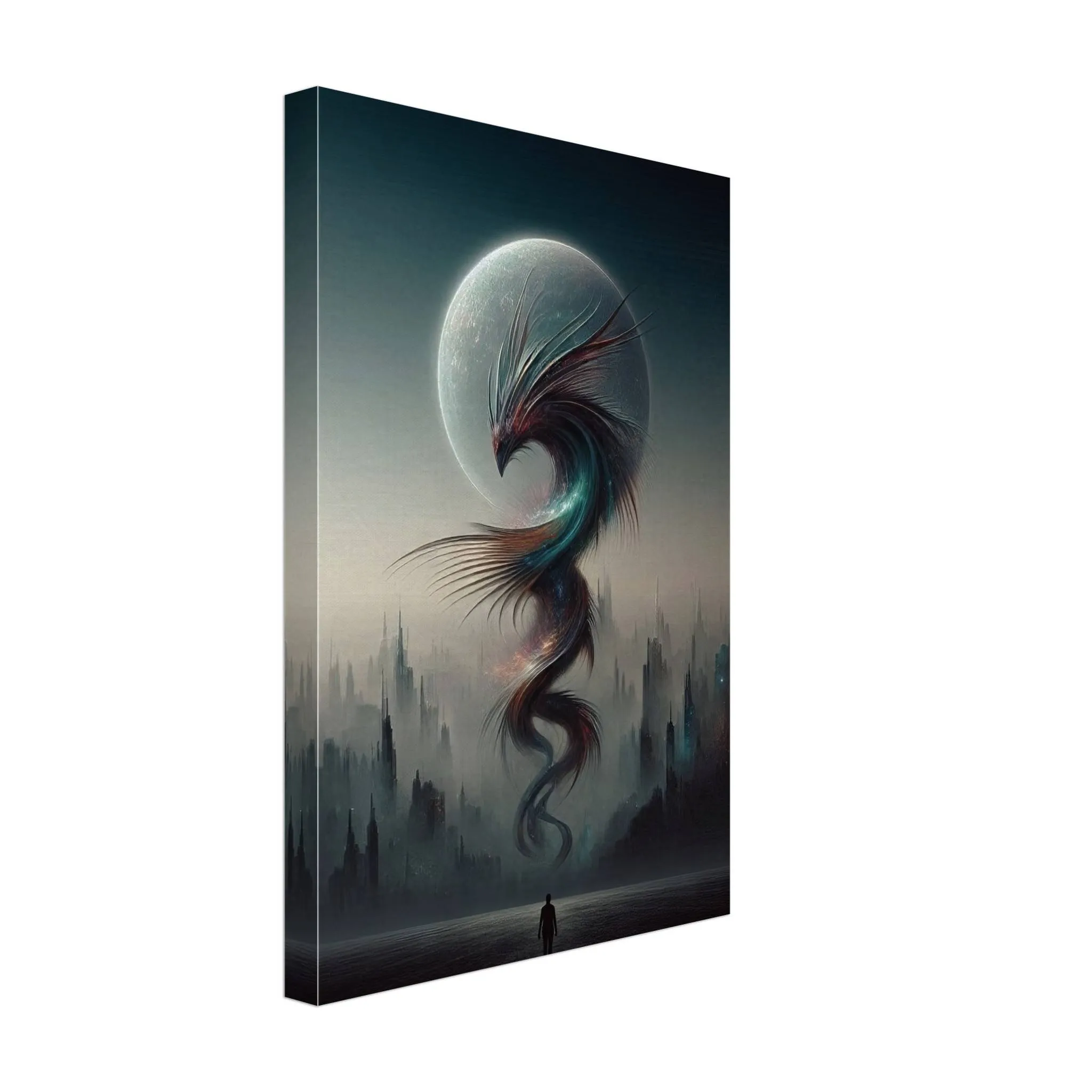 Invite the magic of the cosmos into your space with Celestial Emergence, an awe-inspiring canvas print that blends fantasy, mysticism, and otherworldly beauty. This surreal masterpiece features a majestic creature—part dragon, part cosmic guardian—unfurling its form in graceful spirals above a starlit cityscape. Suspended within a vibrant nebula, it illuminates the skies with presence and power, as if awakening from celestial slumber.