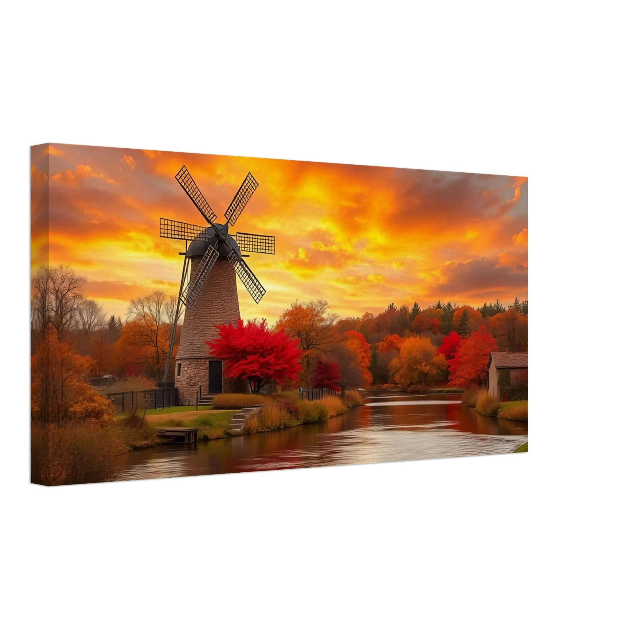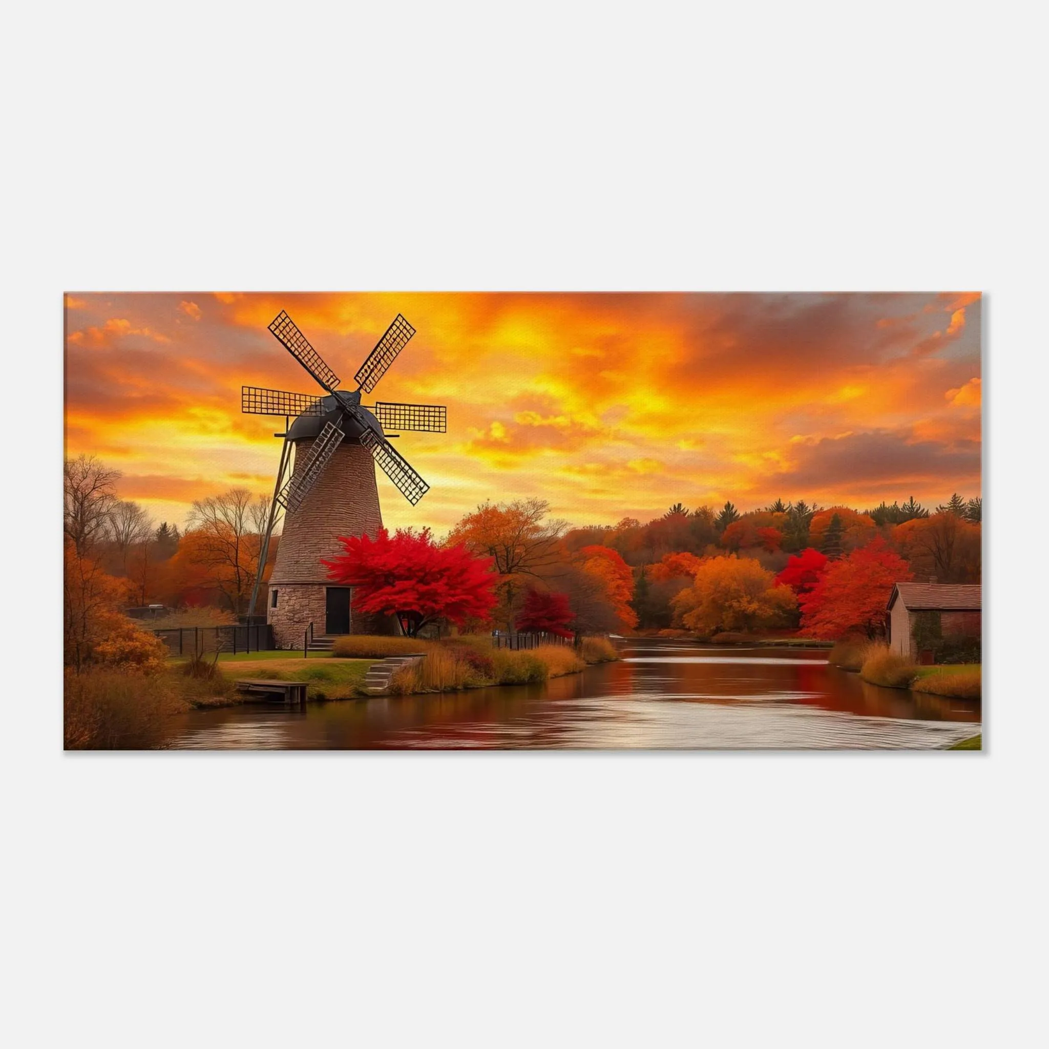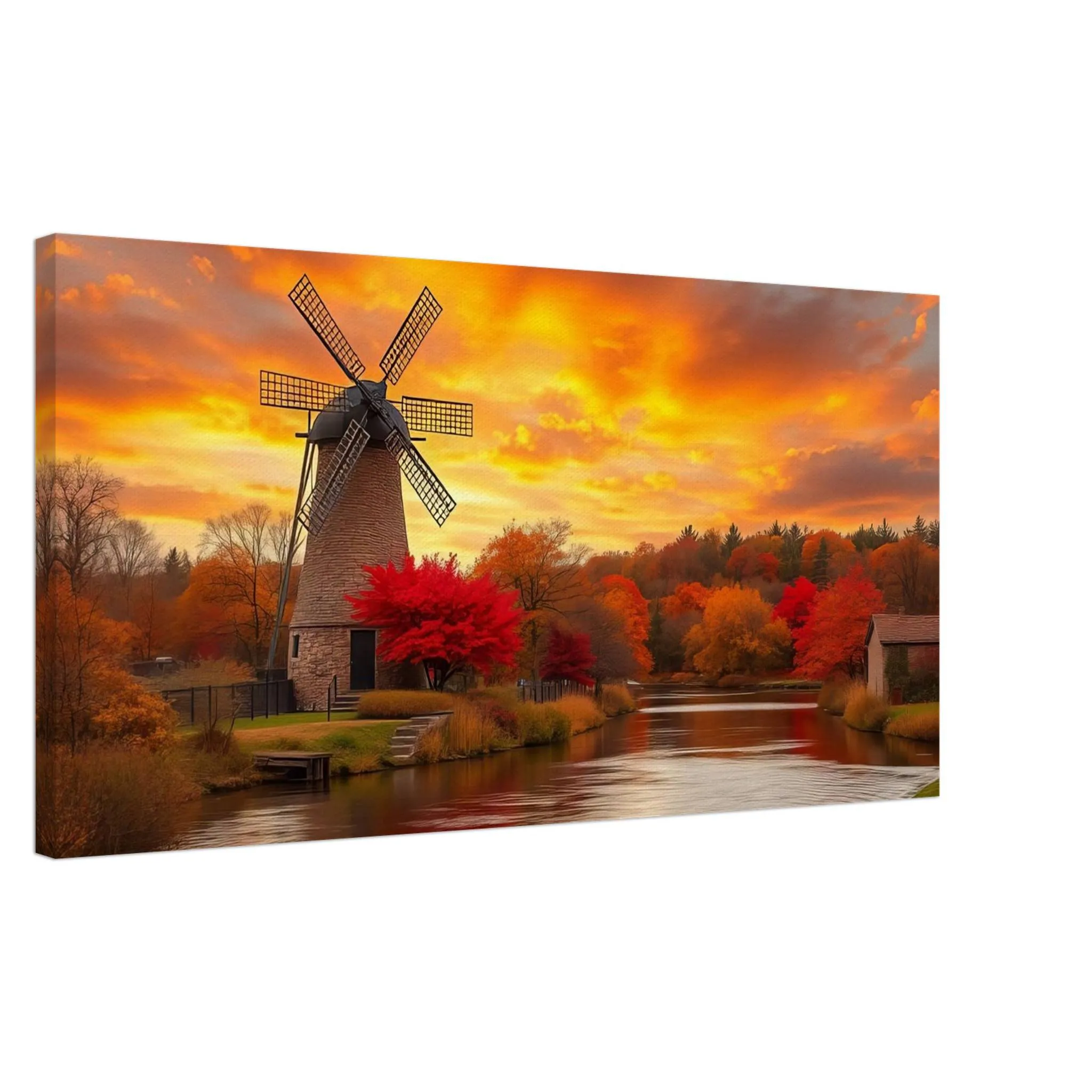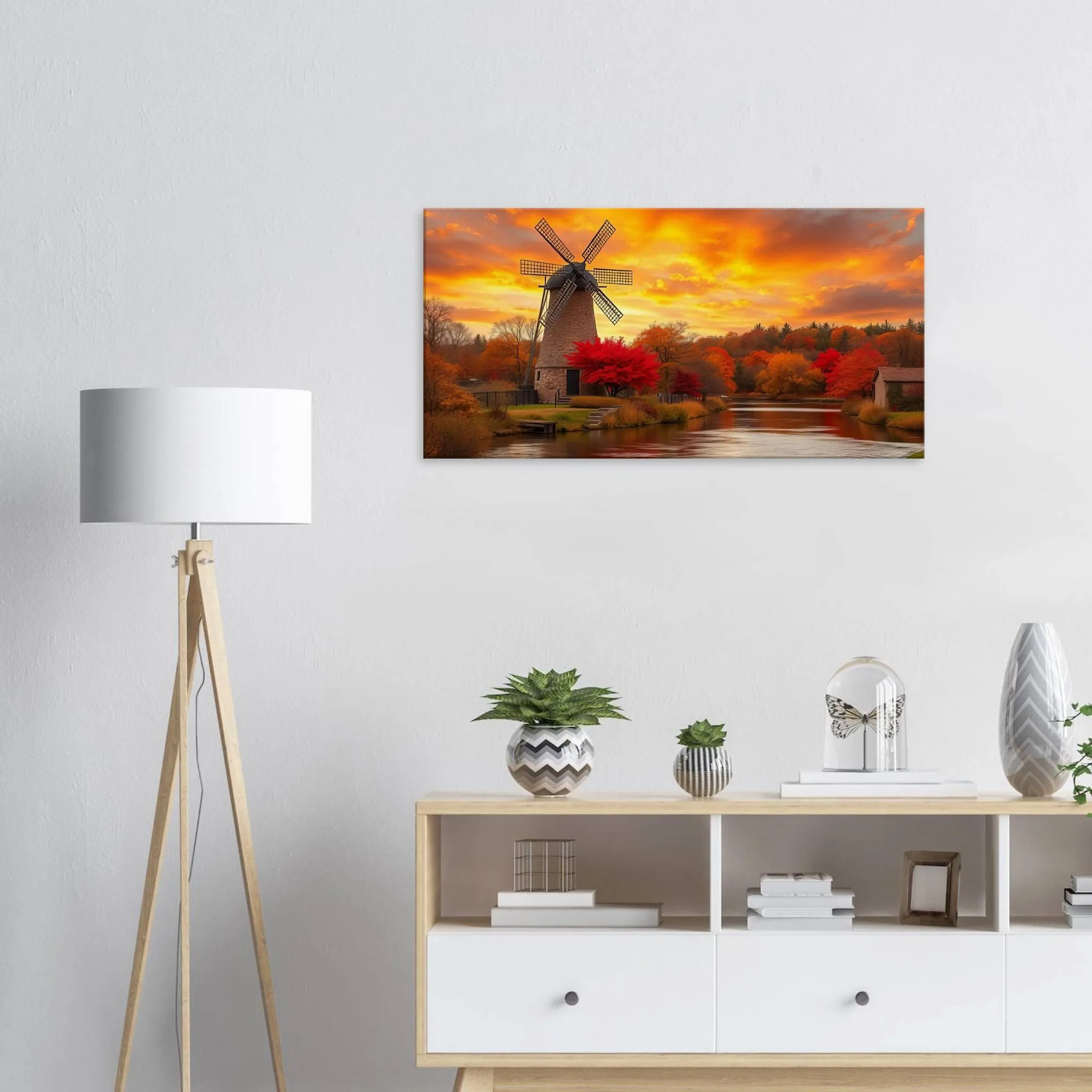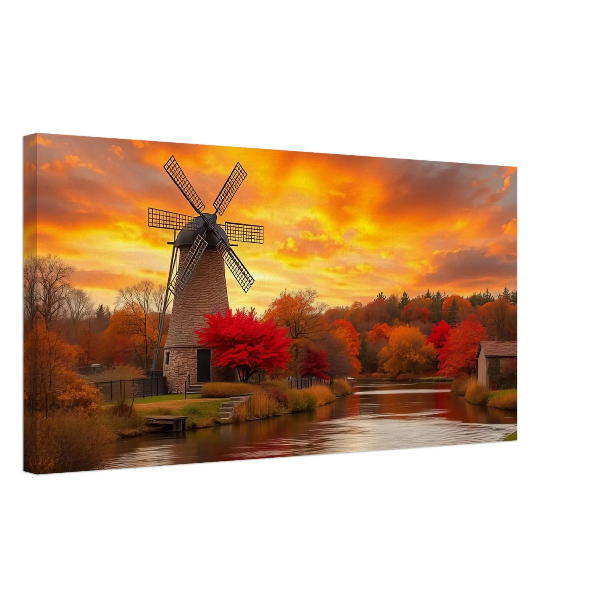 Step into a golden-hour reverie with Crimson Winds at Dusk, a breathtaking canvas wall art piece that captures the soul of a quiet autumn evening. Set against the silhouette of a timeless windmill, the scene unfolds in waves of fiery foliage, amber skies, and still waters reflecting the season’s soft farewell. Every brushstroke echoes the hush of falling leaves and the whisper of history turning slowly in the breeze.
