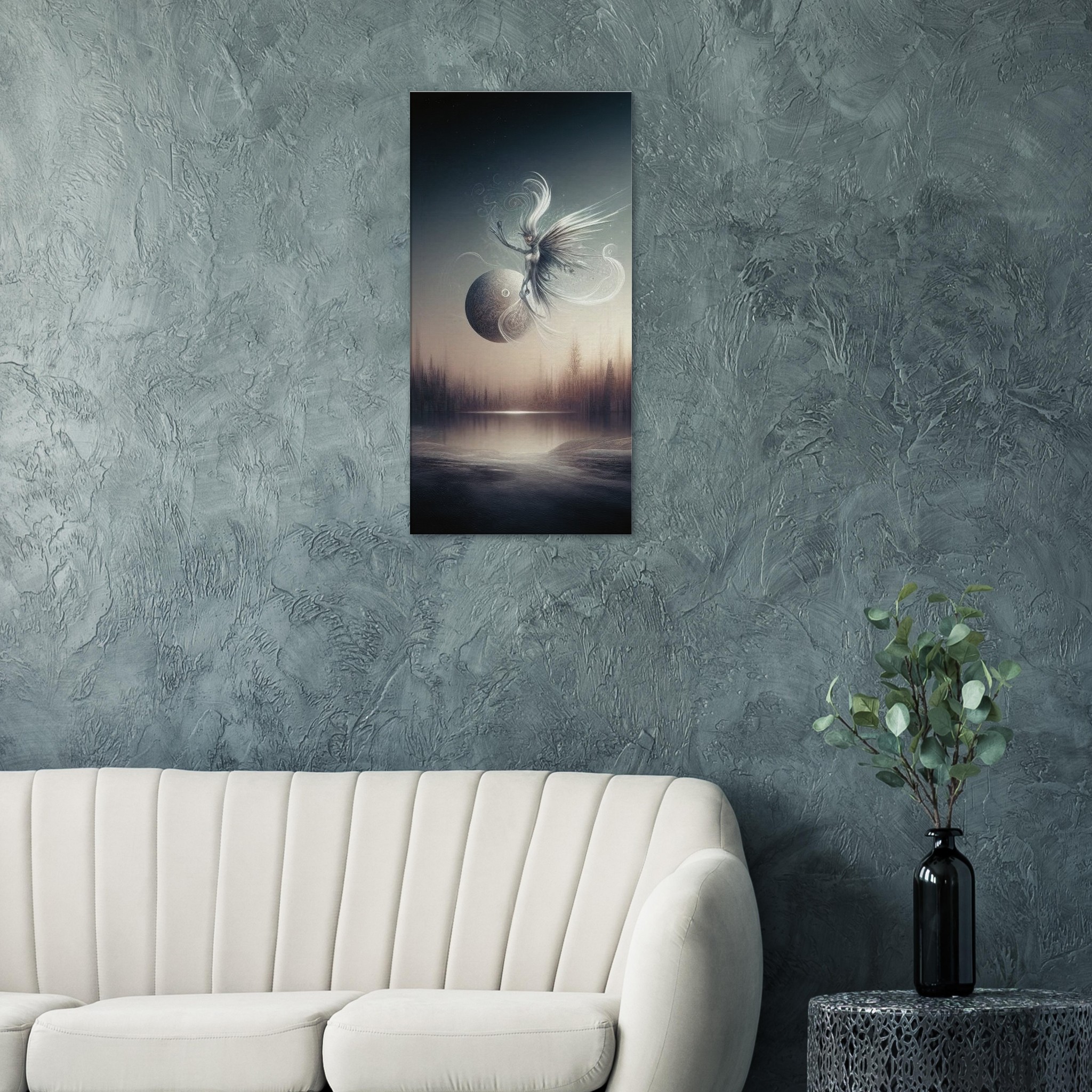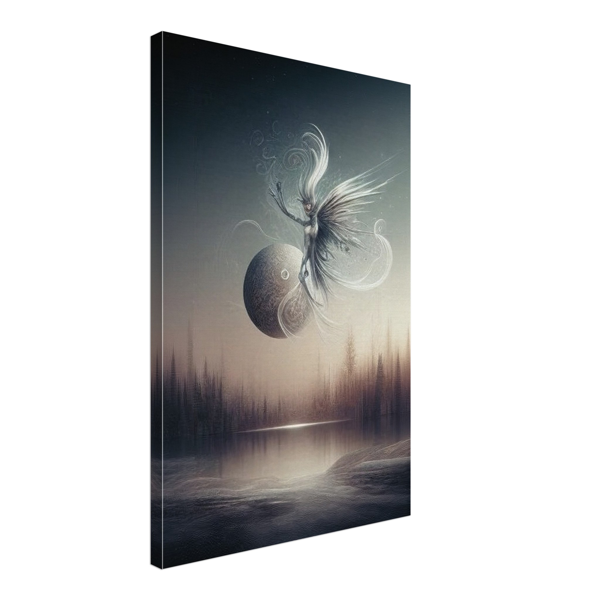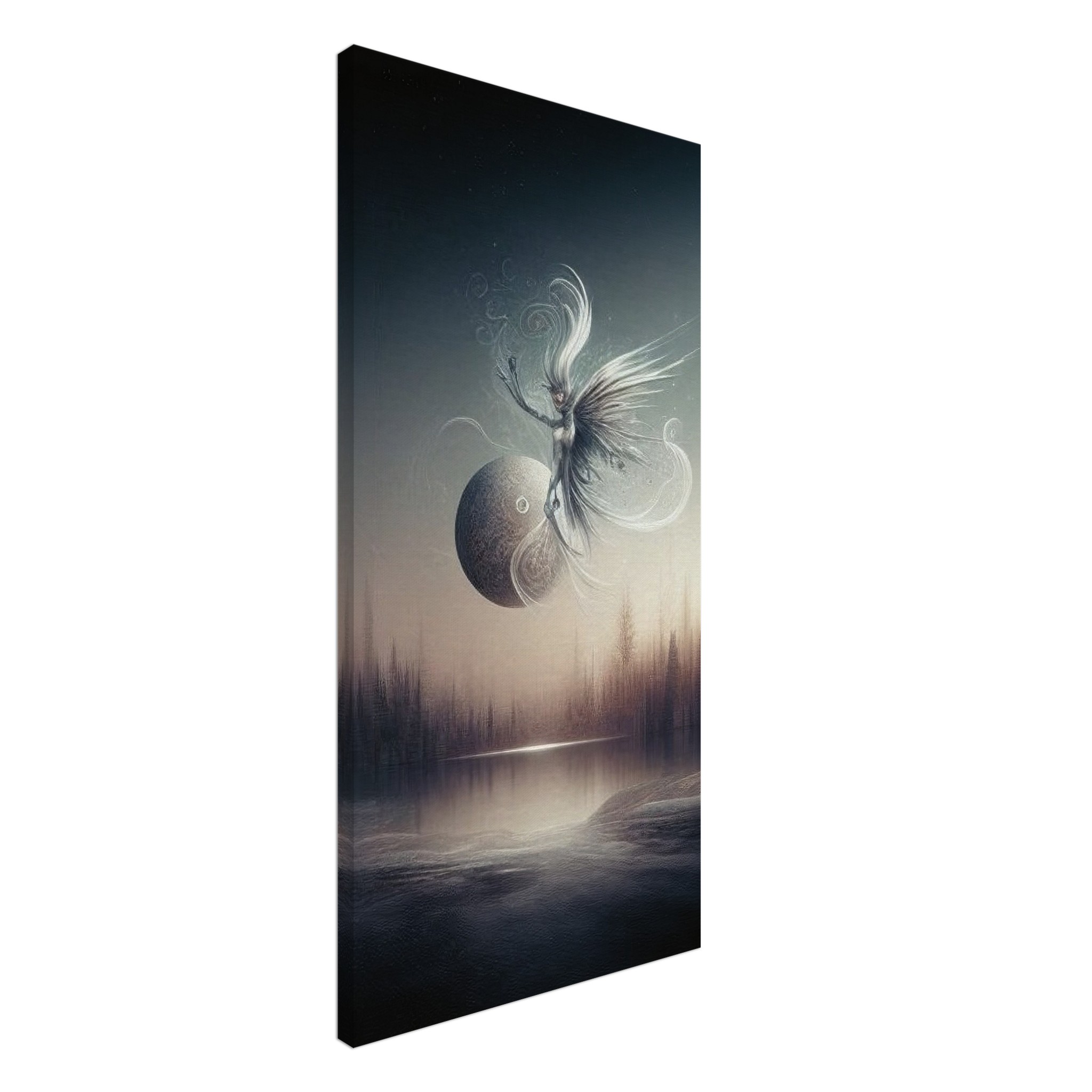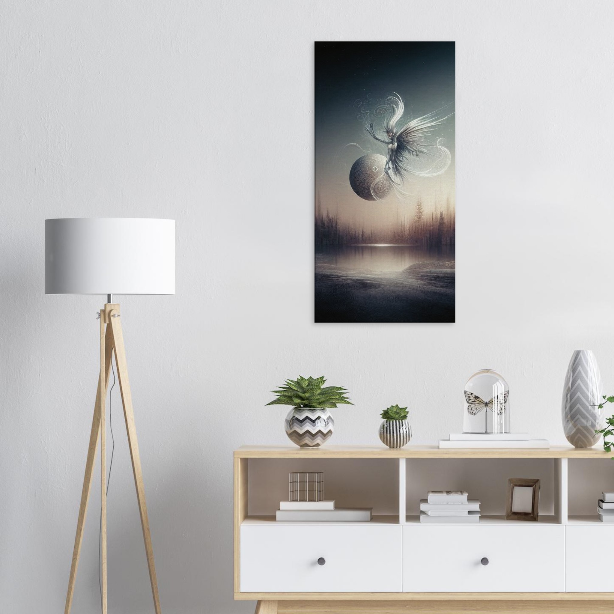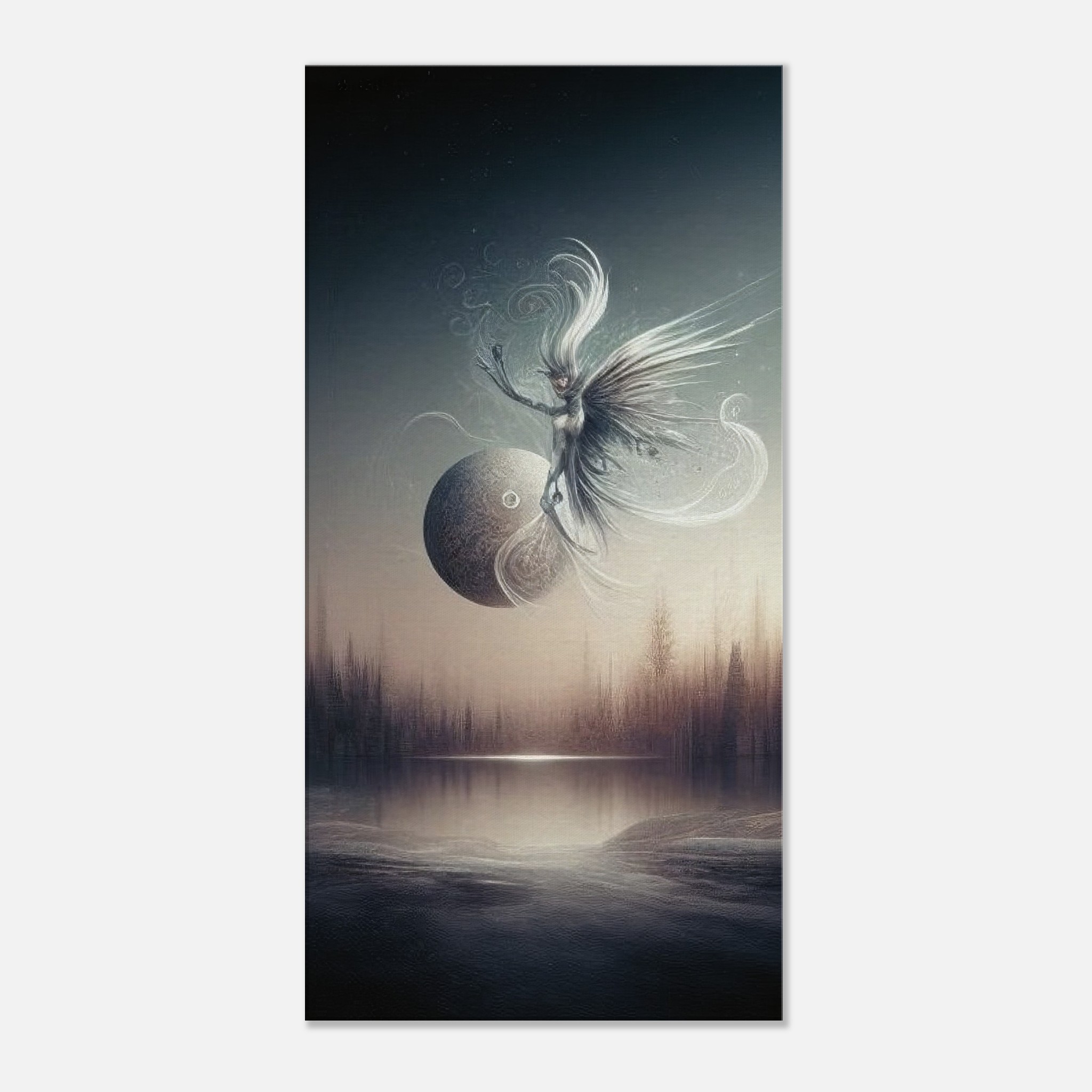 Let moonlight guide your imagination with Lunar Serenade, a spellbinding canvas print that captures the harmony between celestial mystery and earthly peace. At the center of this dreamlike composition floats a luminous figure—part spirit, part muse—drifting weightlessly above a tranquil, moonlit lake. With each glance, this surreal artwork evokes serenity, stillness, and that quiet magic only found in twilight hours.