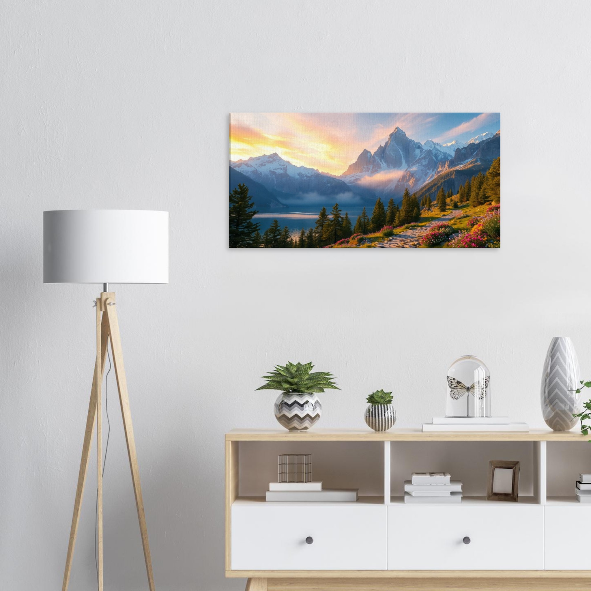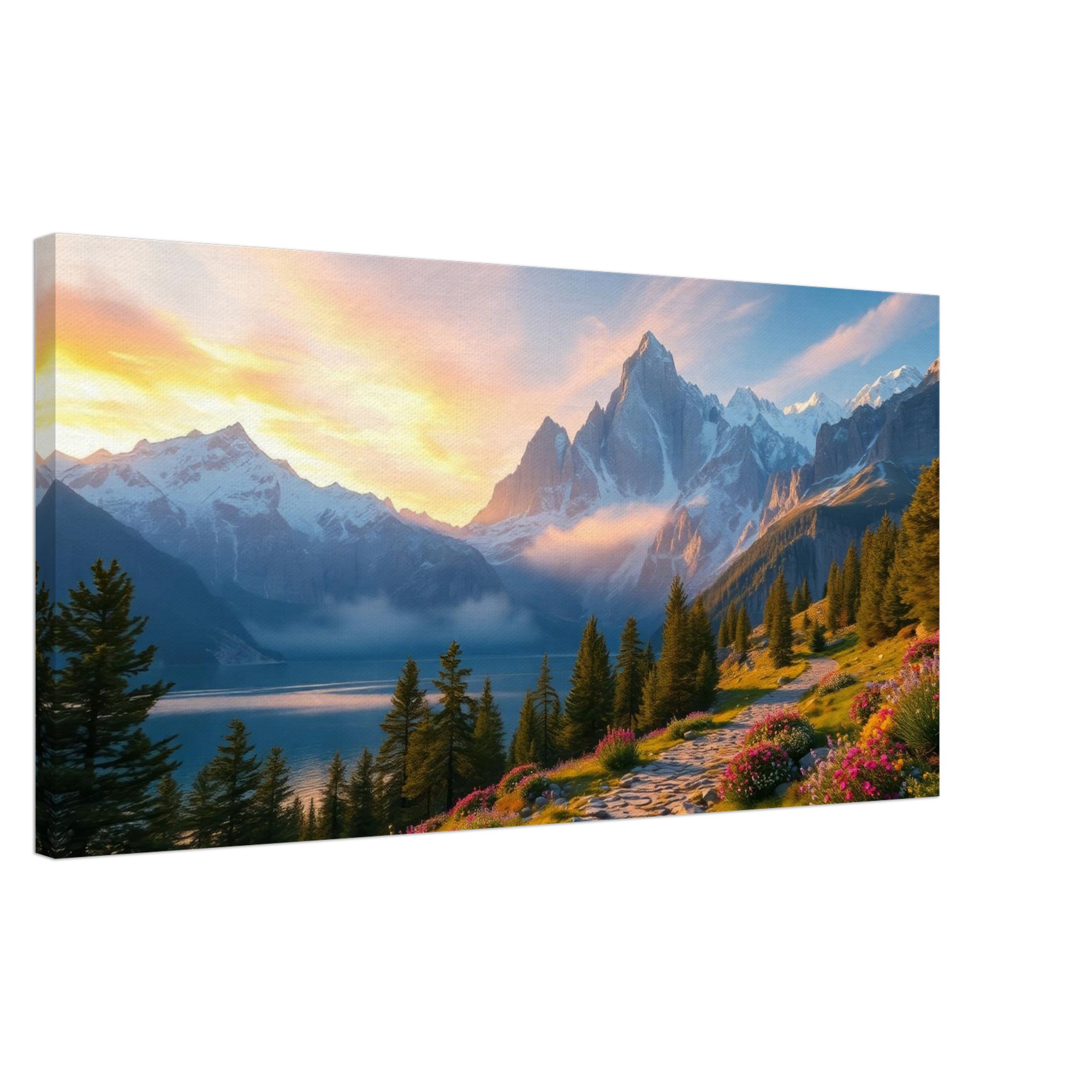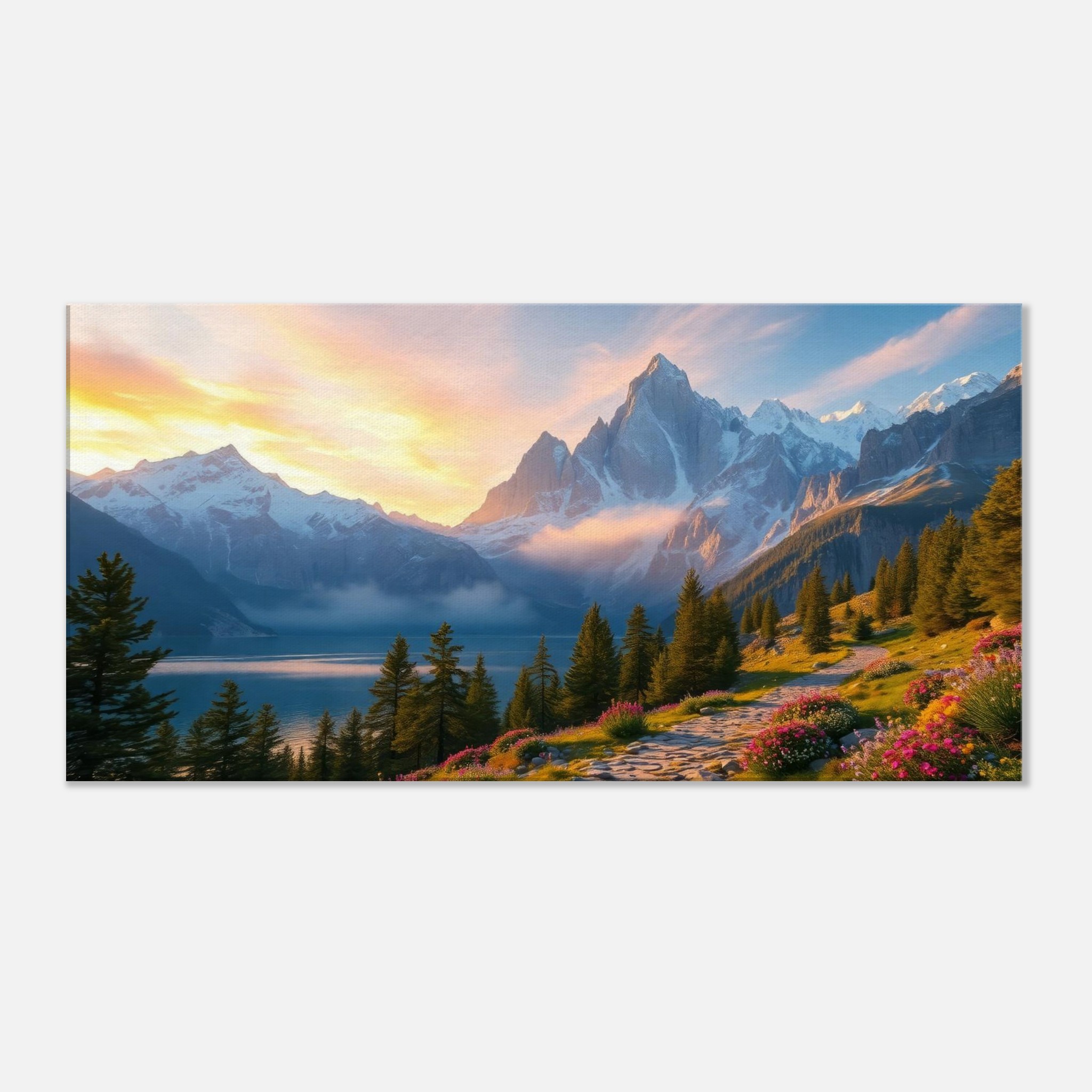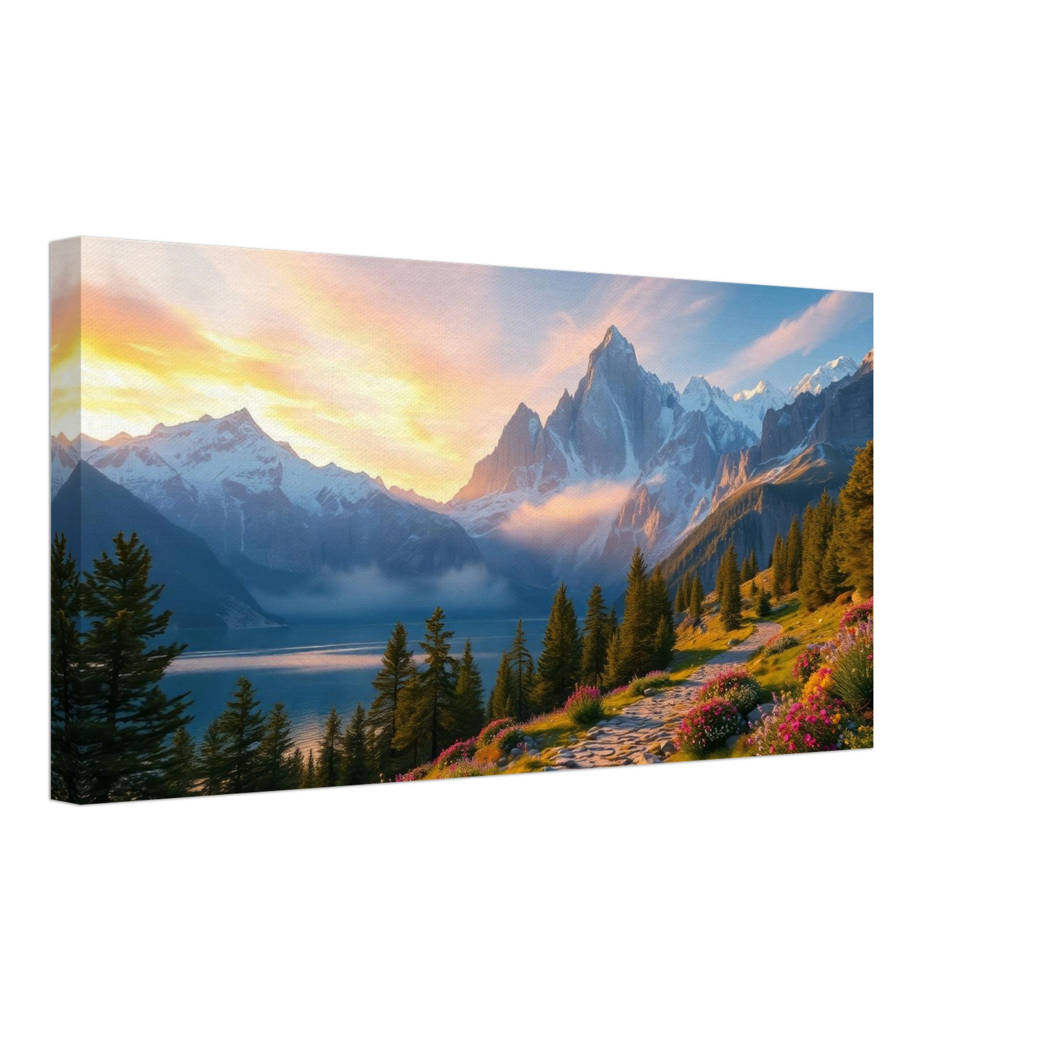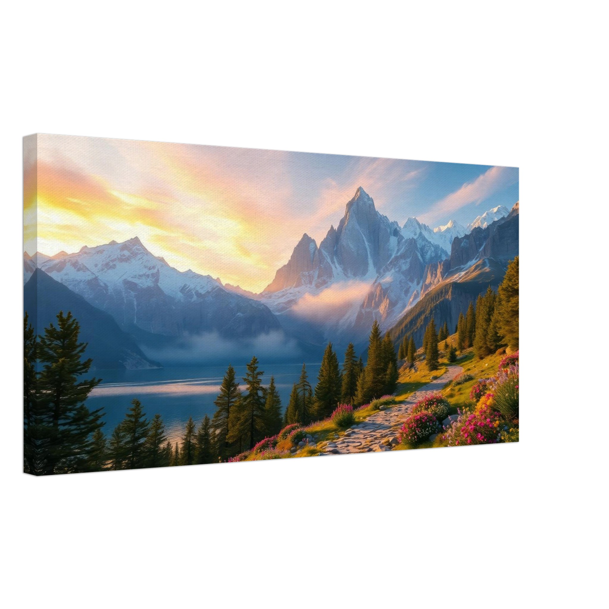 Immerse yourself in the beauty of the great outdoors with the Majestic Horizon Canvas Print—a stunning masterpiece that captures the awe-inspiring majesty of a golden sunset over towering, snow-capped peaks. As the sky glows with hues of amber, lavender, and deep indigo, the fading sunlight bathes the landscape in a soft, ethereal glow. A winding stone pathway, lined with vibrant wildflowers, guides the viewer’s eye toward a crystal-clear lake, mirroring the brilliance of the sky above.