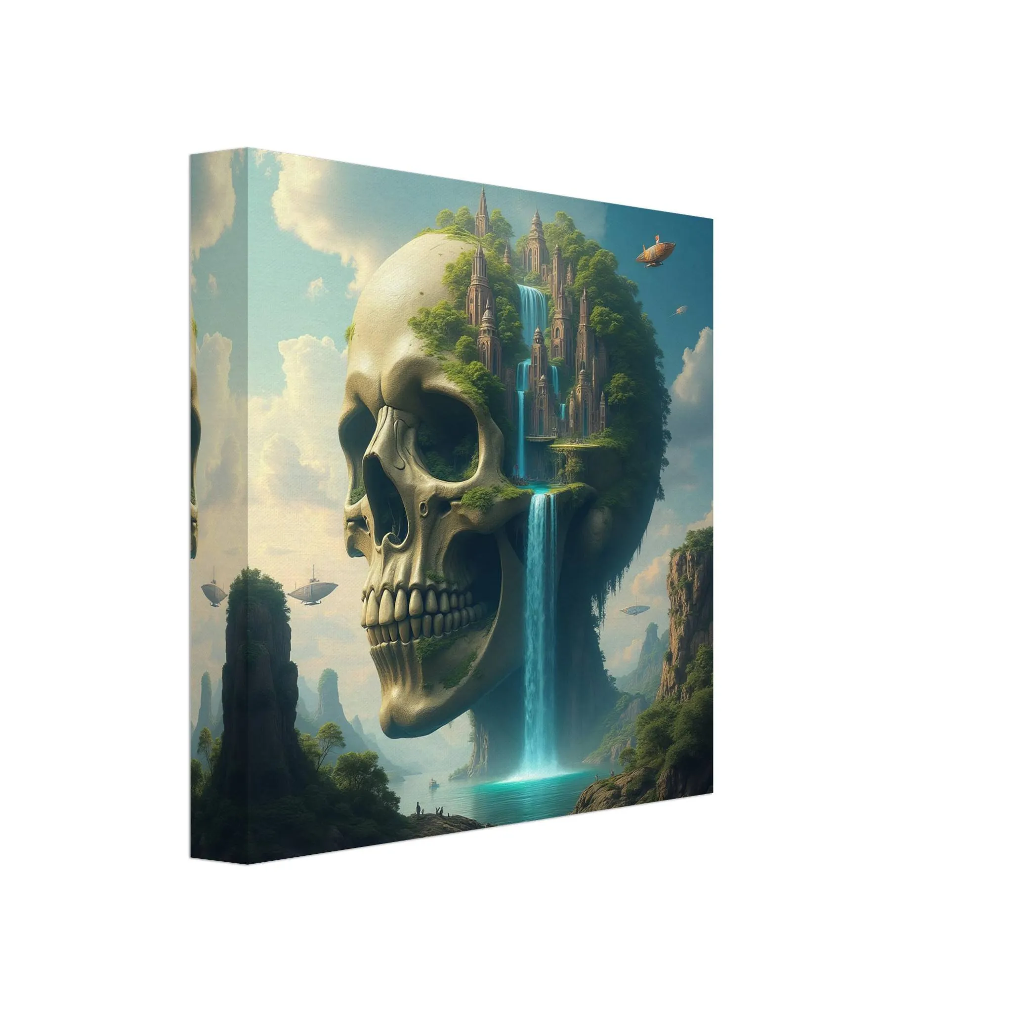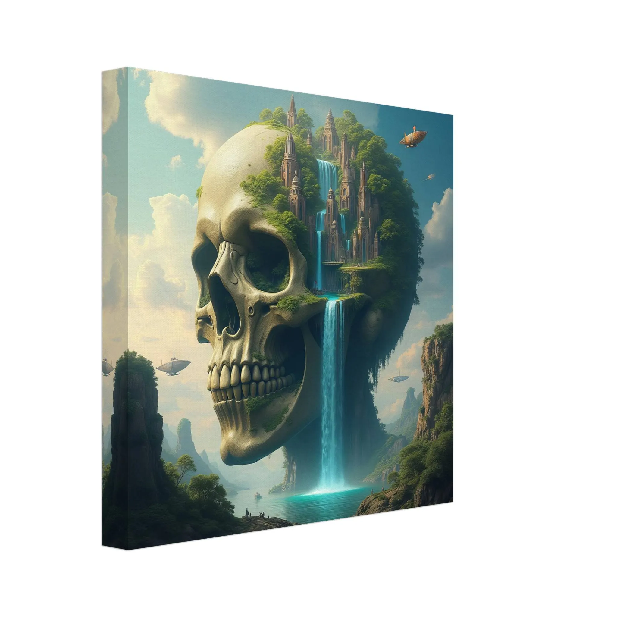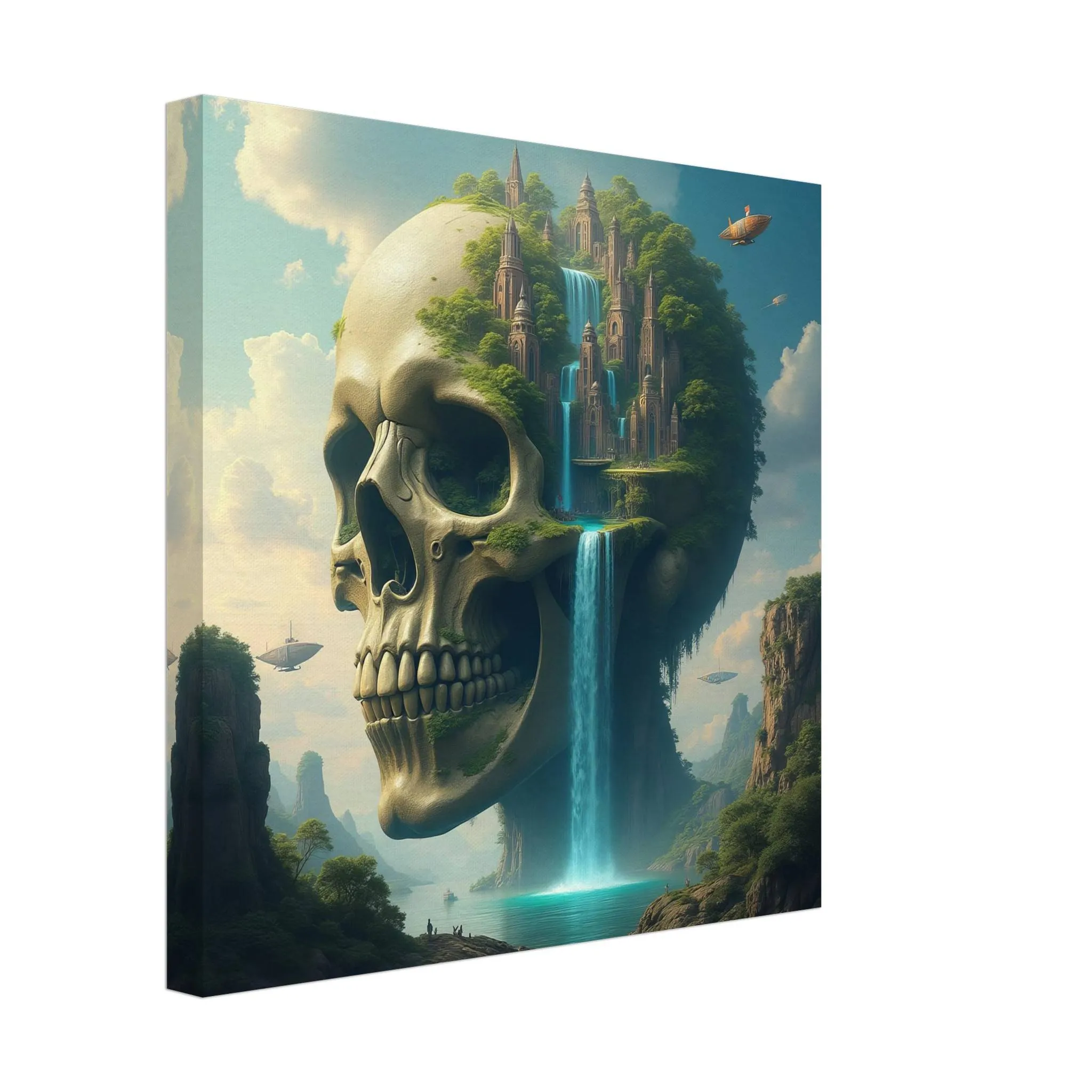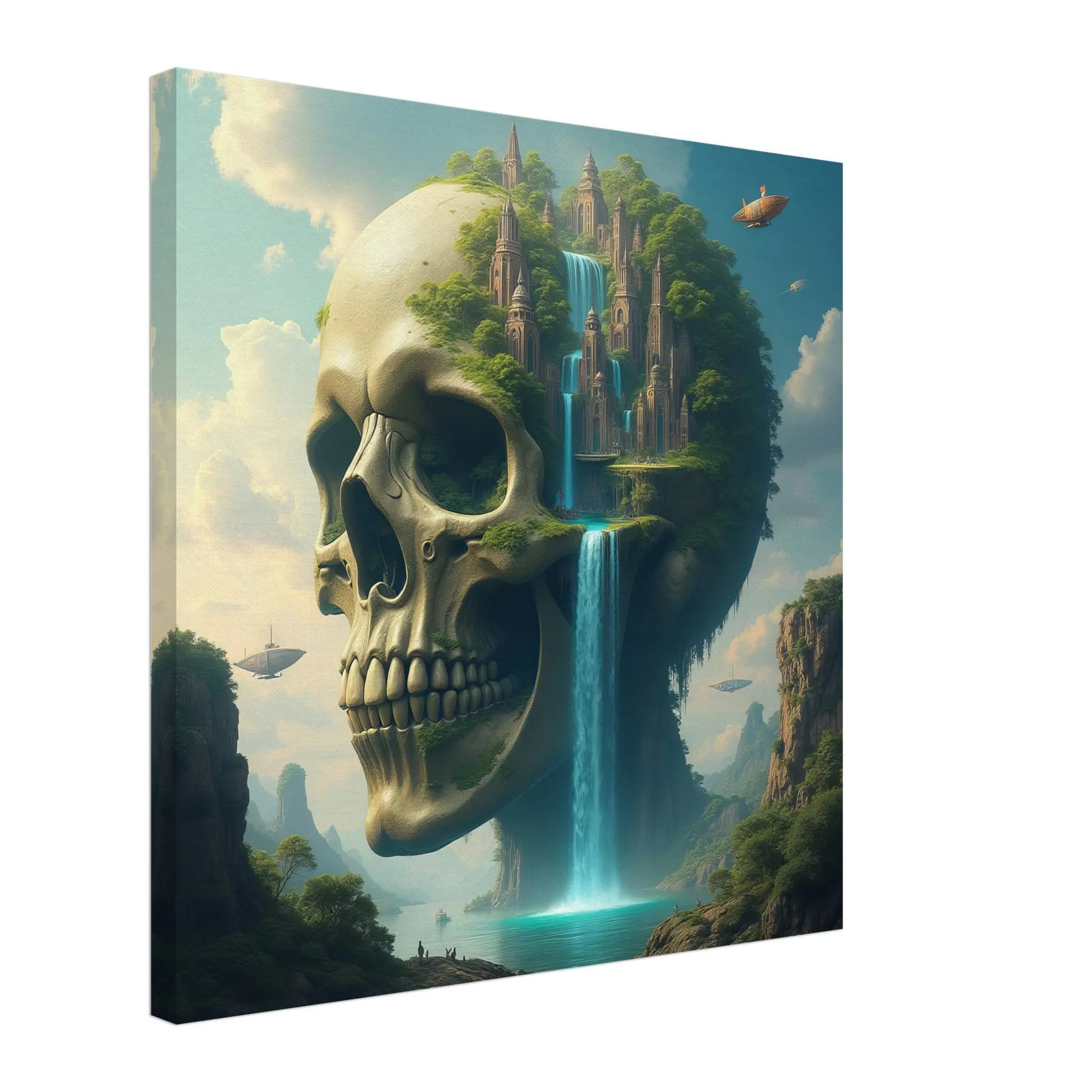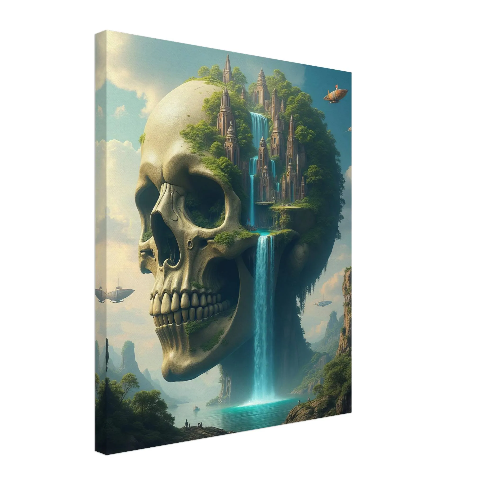 From the skeletal crown of the titan to the delicate lines of ancient towers, this canvas print captures intense visual storytelling. Floating ships, golden-lit clouds, and layered mountain textures draw you deeper into the scene with every glance.