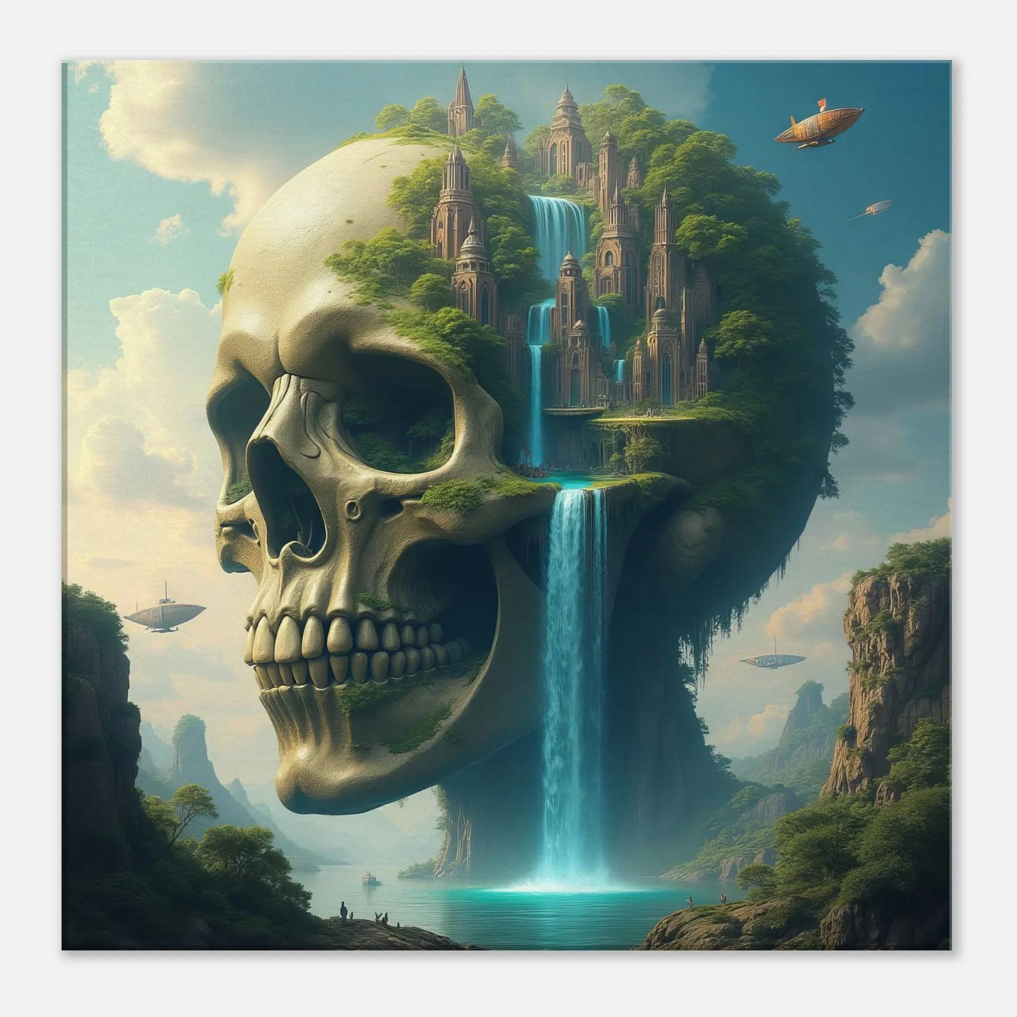 Step into a world lost to time and reclaimed by myth with the Sanctum of the Fallen Titan Canvas Print — a breathtaking visual narrative that blends surrealism, ancient ruin, and high fantasy into one unforgettable statement piece. This exclusive artwork invites you to explore a forgotten realm where the skeleton of a giant lies dormant beneath sky-piercing spires, waterfalls tumble from bone-carved cliffs, and airships float across an ethereal sky lit by a dying sun.