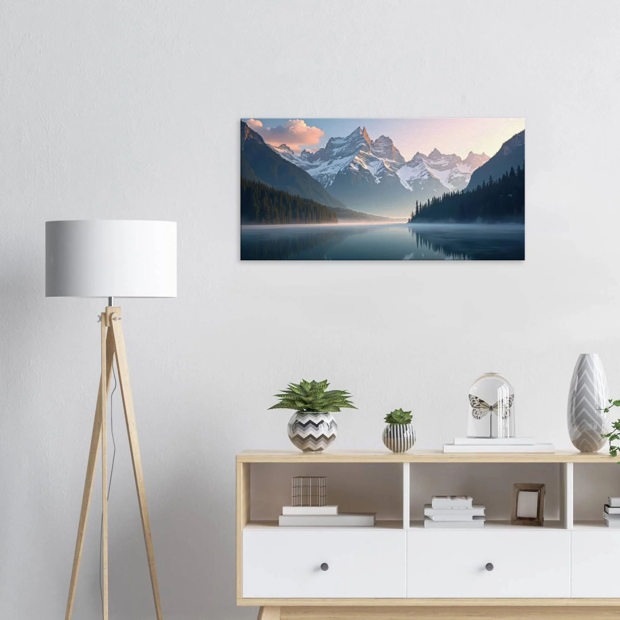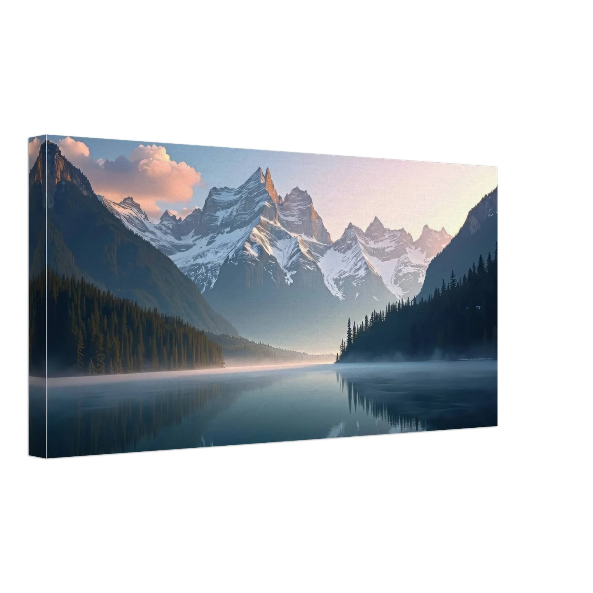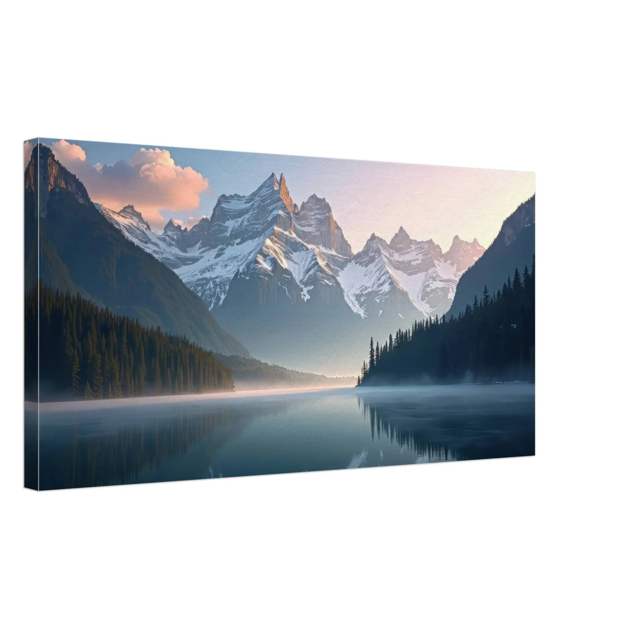 Introducing Whispers of the Alpine Dawn, a breathtaking premium canvas print that captures the hush of early morning in the mountains—just as the first golden light kisses the snow-covered peaks and mist lingers softly over a glassy alpine lake. With pastel skies fading into daybreak and reflections dancing on the water’s surface, this piece evokes clarity, calm, and gentle inspiration, wherever it’s placed.